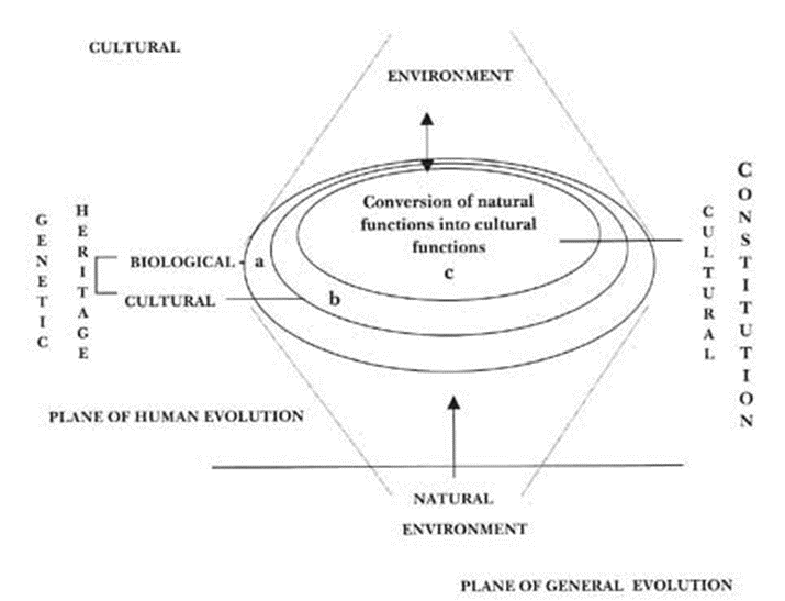 Eş merkezli daireler insan evrimindeki çeşitli evreleri temsil eder. Dış daire (a) atalarımızın ilkel biyolojik mirasını temsil ederken, ikinci daire (b) bu mirası insanın sosyal tarihi boyunca kültür tarafından dönüştürülmüş halini temsil eder. İç daire (c) insanlığın kültürel tarihi içindeki her bir bireyin özgül ve somut tarihini temsil eder.