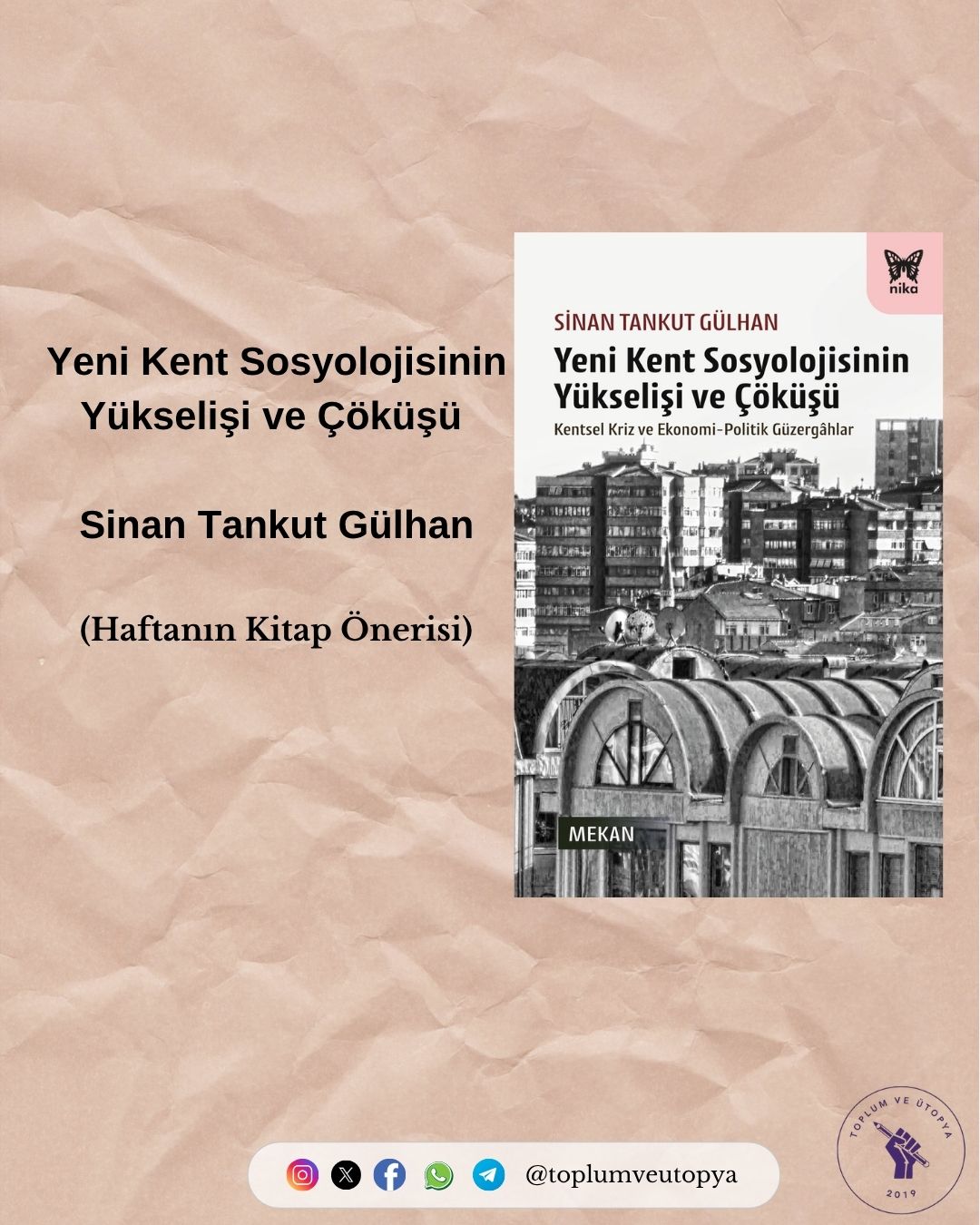 Haftalık kitap önerilerimizde bu haftanın kitabı Sinan Tankut Gülhan tarafından kaleme alınan “Yeni Kent Sosyolojisinin Yükselişi ve Çöküşü” başlıklı kitap.
